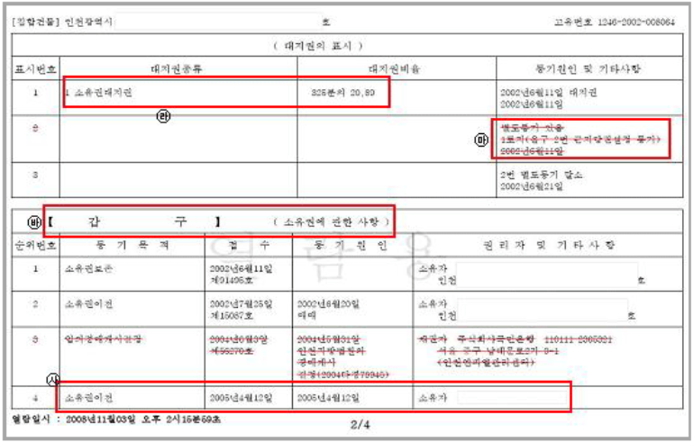 - 갑구: 소유권, 저당권, 매매 이력 등
